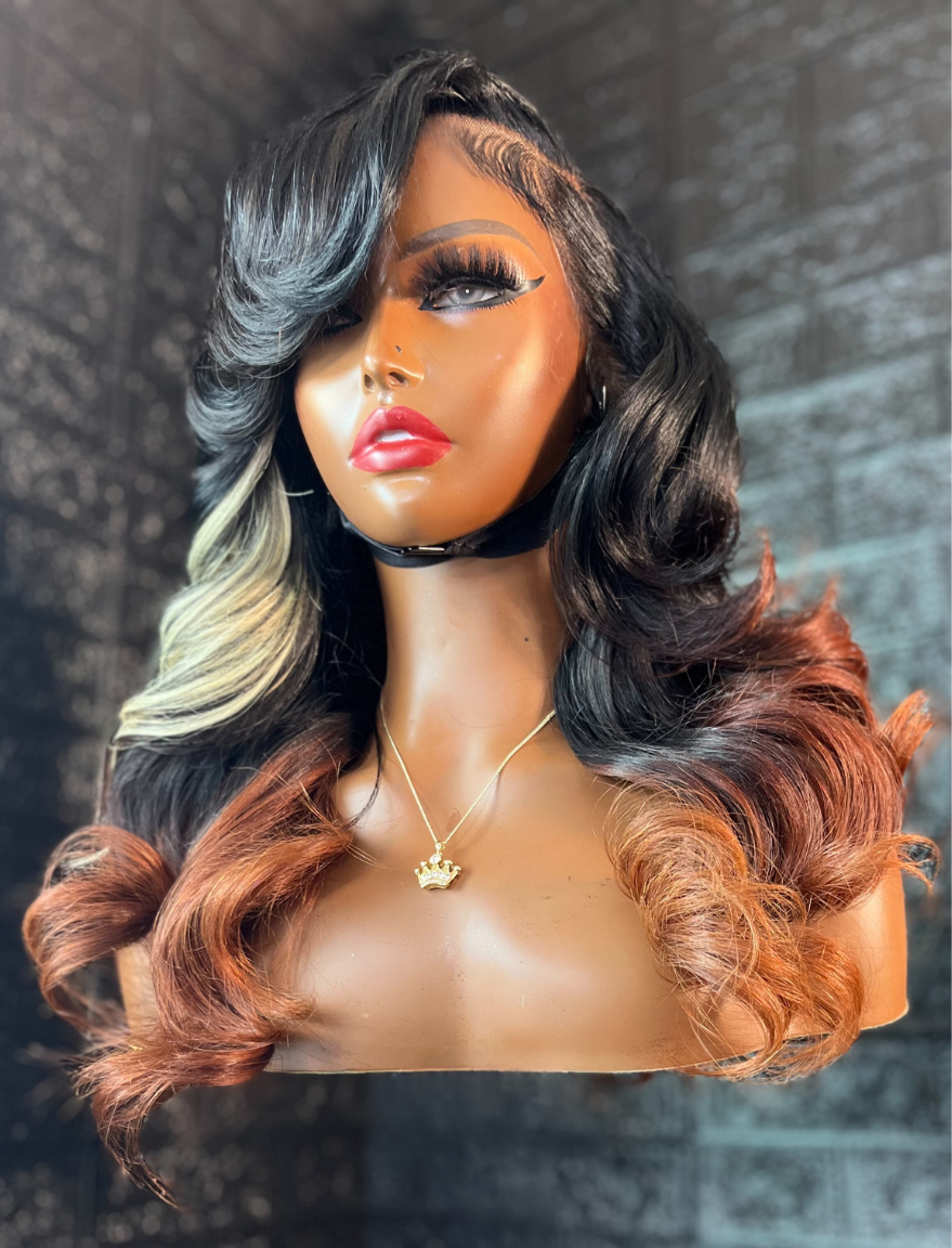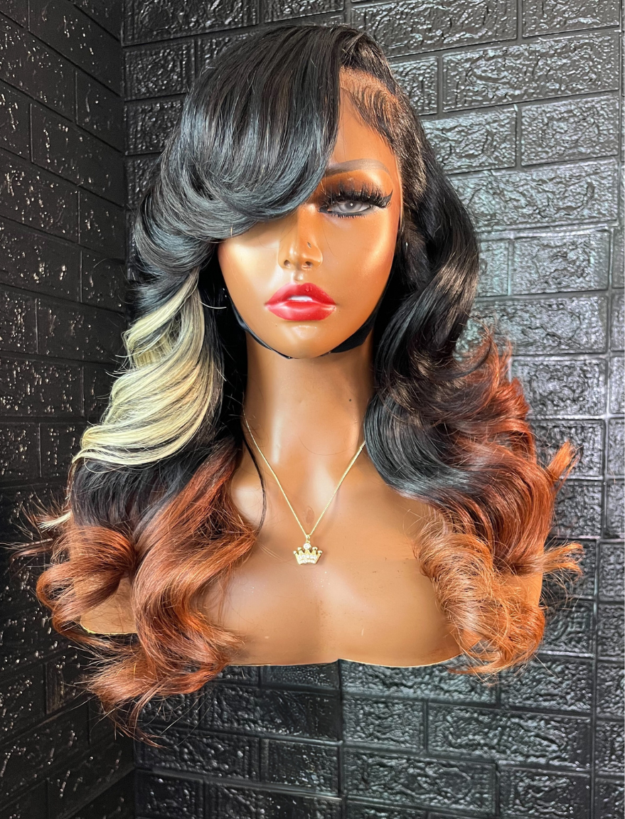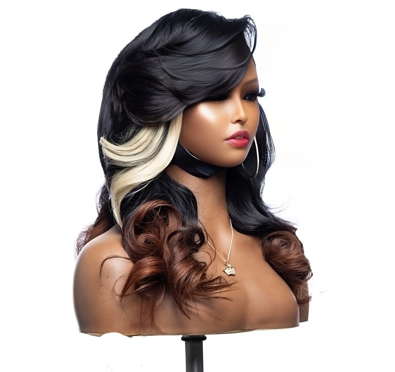 - Color: Jet black, bronze ombre with blonde streak patch.